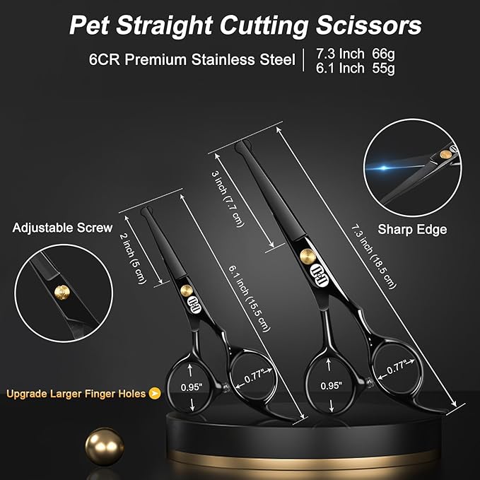 - 😺Multipurpose Pet Grooming Scissors: Equipped with the best size scissors for pet hair grooming(Length of 6.1 inch and 7.3 inch), Perfect for trimming cutting thinning grooming face, paws and body hair, thick fur, long hair and curly hair of small / large dogs, cats, rabbits, small horses, sheeps and other pets. And we can use the grooming scissors at home or pet groomer salon.
