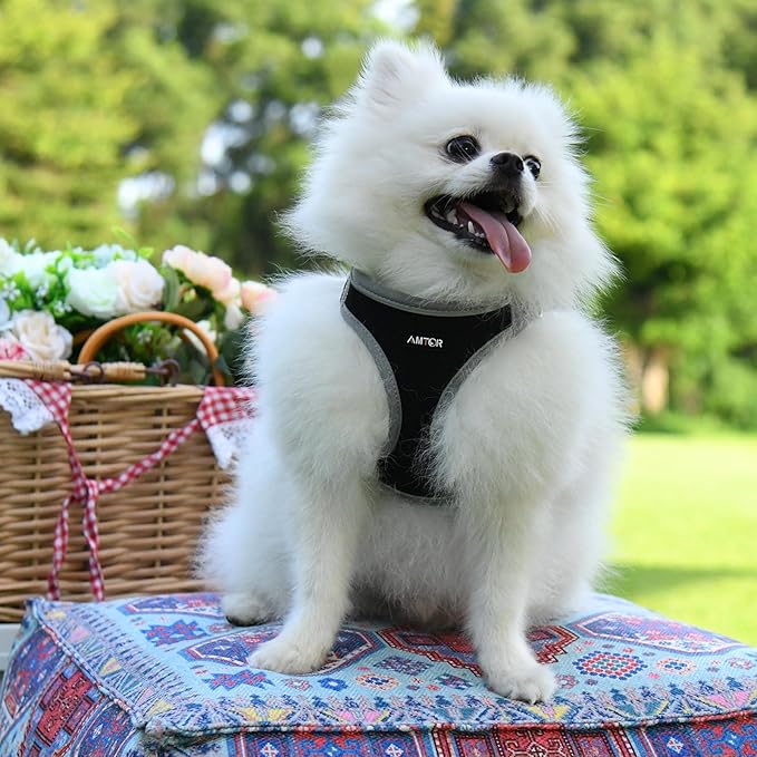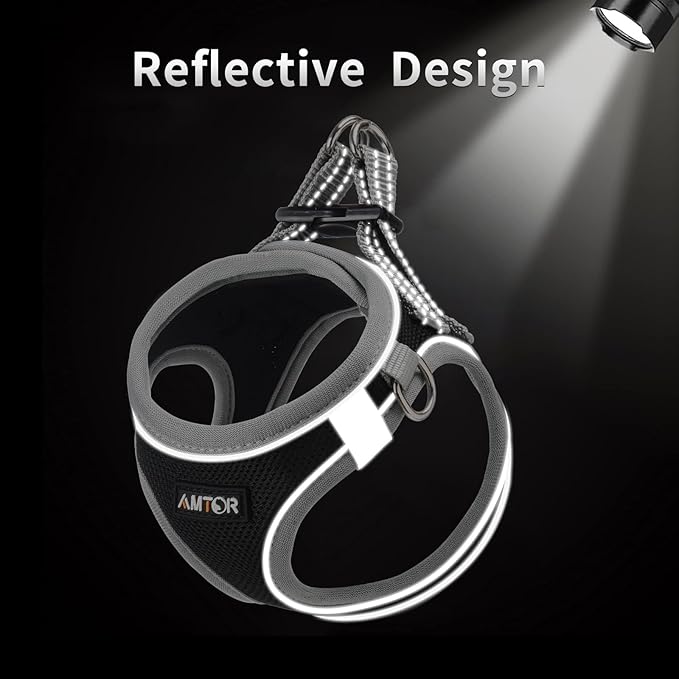 • Reflective dog harness - AMTOR small dog harness with Magic Tape,buckle and double D-rings work together protect your pet in three layers of security. The 360° highly reflective strips provide good visibility in the dark