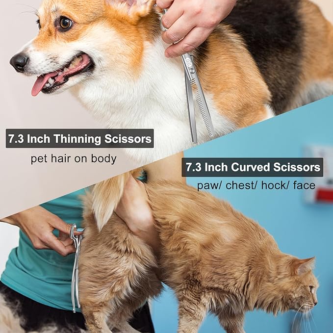 - 😺Multipurpose Pet Grooming Scissors: Equipped with the best size scissors for pet hair grooming(Length of 6.1 inch and 7.3 inch), Perfect for trimming cutting thinning grooming face, paws and body hair, thick fur, long hair and curly hair of small / large dogs, cats, rabbits, small horses, sheeps and other pets. And we can use the grooming scissors at home or pet groomer salon.