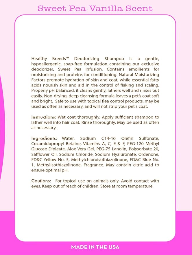 • Hypoallergenic formula is safe for use with topical flea control treatments. Healthy Breeds Deodorizing Shampoo is gentle and soap-free leaving your dog’s coat silky and lustrous!