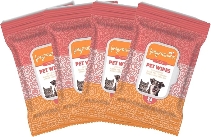 FurryFriends Pet Wipes | Citrus Scented | Hypo-allergenic | Alcohol Free| Deodorizing | Removes Loose Hair & Dirt | Incredibly Clean | 4 Pack
