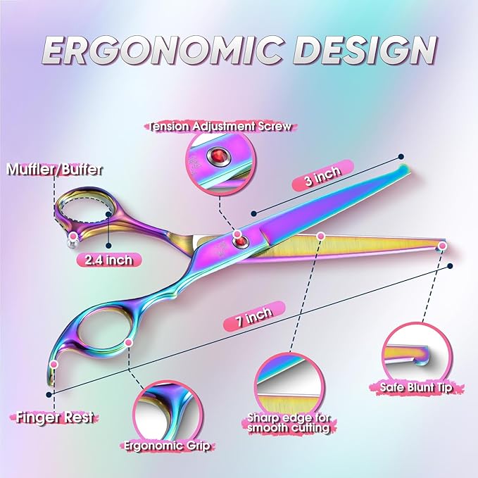 7" Multicolour Dog Grooming Kit - Premium Japanese 440C Stainless Steel Straight Scissors, Thinning Shears, Curved Scissors, Chunker Shears with Steel Comb