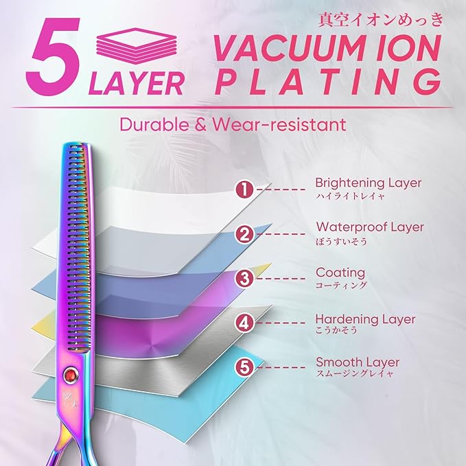 - Convex Blades: Each shear in this pet grooming set boasts arch blades that are hollow ground on the inside and ends in a tapered point. This design creates a smaller blade edge, reducing friction between the blades. And the hollow ground provides extra space, which effectively prevents hair from jamming or tangling within the blades. This feature not only ensures a seamless grooming experience, but also avoids unnecessary discomfort for your fluffy companion.