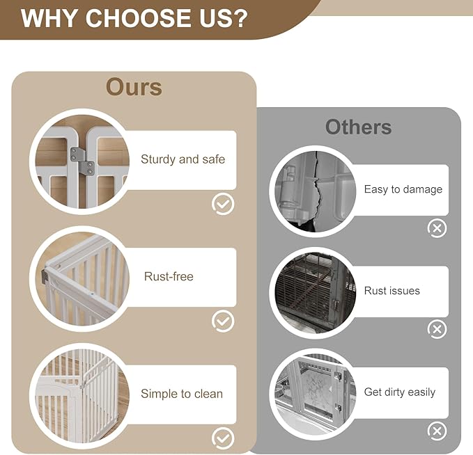 • SECURE AREA: Give your pet an entertainment space that belongs to it.Pet playpen tall enough for a small pet to reach into the enclosure, puppy playpen keeps your pets safe from others.Our pet fence is made of safe, high-quality plastic, and is artificially trimmed, smooth and burr-free, so You don’t have to worry about your pet getting hurt.