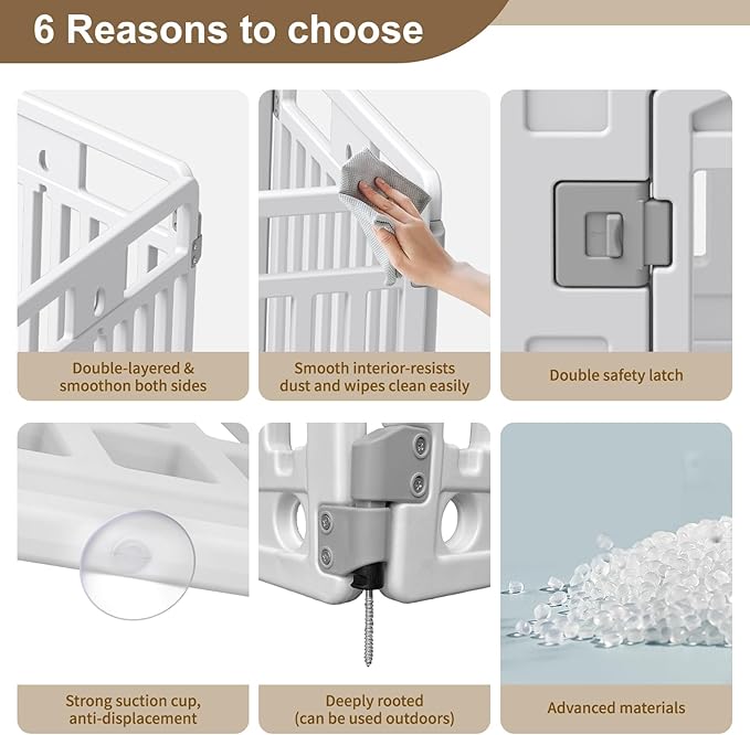 • EASY TO INSTALL: Our dog fence comes with 5 panels and 1 panel with door,pet playpen constructed with simple assembly instructions will set up in minutes. You can quickly place the pet fence where you want.Door panel with latch type door lock to prevent puppy from entering and exiting at will