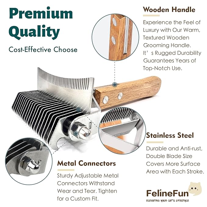 • ใ€๐—–๐—ผ๐—บ๐—ณ๐—ผ๐—ฟ๐˜๐—ฎ๐—ฏ๐—น๐—ฒ ๐—š๐—ฟ๐—ผ๐—ผ๐—บ๐—ถ๐—ป๐—ด ๐—˜๐˜…๐—ฝ๐—ฒ๐—ฟ๐—ถ๐—ฒ๐—ป๐—ฐ๐—ฒใ€‘Rounded Ends make it Safer on Sensitive Skin, Functioning as an Effective Undercoat Brush. The Anti-Slip High-Qulity Wooden Grip Guarantees a Comfortable and Relaxing Brushing Experience for Both you and your Feline Companion.