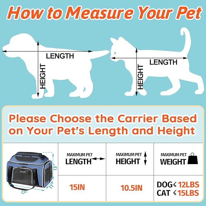 - 【CHECK SIZE BEFORE BUYING】In order to fit the under-seat dimensions of airlines, this carrier can only fit small dogs and cats. We recommend that the pet size you carry be within 15"L x 9"W x 10.5"H and weight under 12LBS. Please don't choose the carrier only based on weight but also reference your pet's length and height.