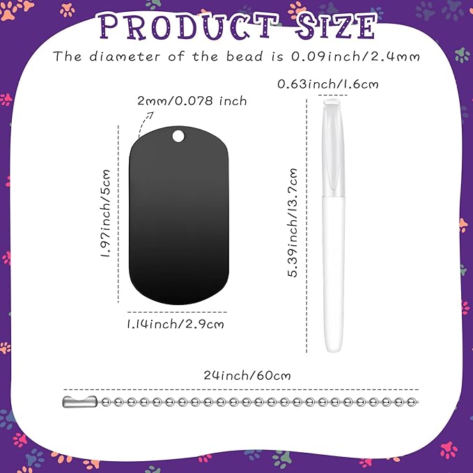 • Size Information: each blank military dog tag is about 1.97 x 1.14 inches/ 5 x 2.9 cm, and the marker pen is about 5.39 inches/ 13.7 cm in length, they are all small and light, easy to carry and store; The chain is approximately 24 inches/ 60 cm long, which can be easily threaded through the hole on the dog tag and adjusted to the length you need