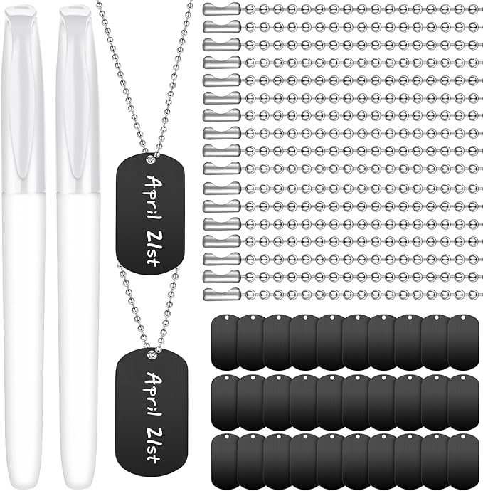 • Complete Set: the package contains 30 pieces of aluminum alloy blank dog tags, 30 pieces of 24 inch dog tag chains and 2 erasable white marker pens, which can be DIY designed into 30 different dog tag necklaces, share with your relatives and friend