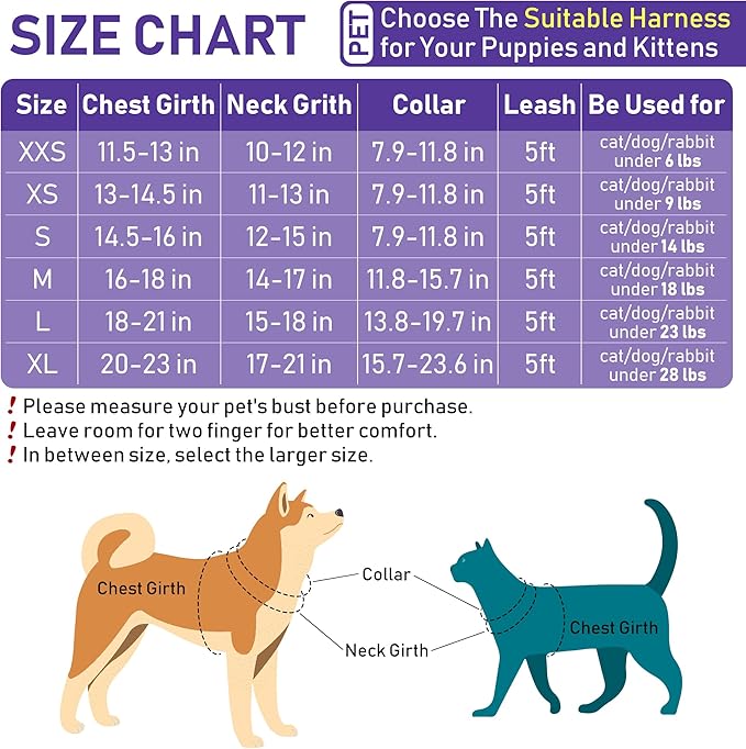 - SIZE CHART - [XXXS: Harness Chest 10"-12", Harness Neck 9"-11", Collar Length 7.9"-11.8"]; [XXS: Harness Chest 11.5"-13", Harness Neck 10"-12", Collar Length 7.9"-11.8"]; [XS: Harness Chest 13"-14.5", Harness Neck 11"-13", Collar Length 7.9"-11.8"]; [S: Harness Chest 14.5"-16", Harness Neck 12"-15", Collar Length 7.9"-11.8"]; [M: Harness Chest 16"-18", Harness Neck 14"-17", Collar Length 11.8"-15.7"]; [L: Harness Chest 18"-21", Harness Neck 15"-18", Collar Length 13.8"-19.7"]; [XL: Harness Chest 20"-23", Harness Neck 17"-21", Collar Length 15.7"-23.6"]. Please always measure your dog and refer to our brand size chart!