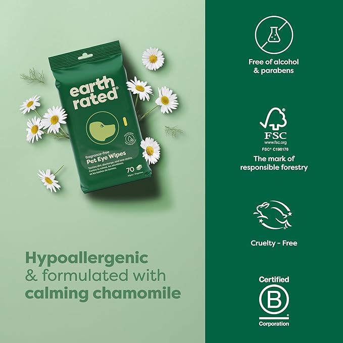 Earth Rated Vet-Developed Pet Eye Wipes, Hypoallergenic Cleaner for Dogs & Cats Eyes to Remove Dirt & Discharge, Fragrance Free, 70 Count