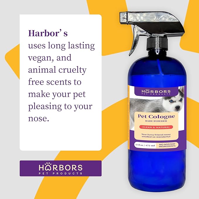 • GROOMER RECOMMENDED. Our pet cologne is recommended by professionals for dogs, cats, puppies, kittens, ferrets, guinea pigs and rabbits of all ages with normal or sensitive skin. A few spritzes will have your beloved fur companion smelling like they just came from the grooming day spa. Harbor’s Baby Powder pet cologne is suited for all types of fur.