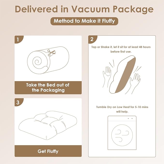 • MACHINE WASH and CARE INSTRUCTION - The washable dog bed can be put directly into the washing machine as a whole. This plush dog bed is vacuum-compressed, please remove the compression bag, shake it completely, and leave it for about 24 hours to expand. After washing and before use, please shake the bed back fluffy.