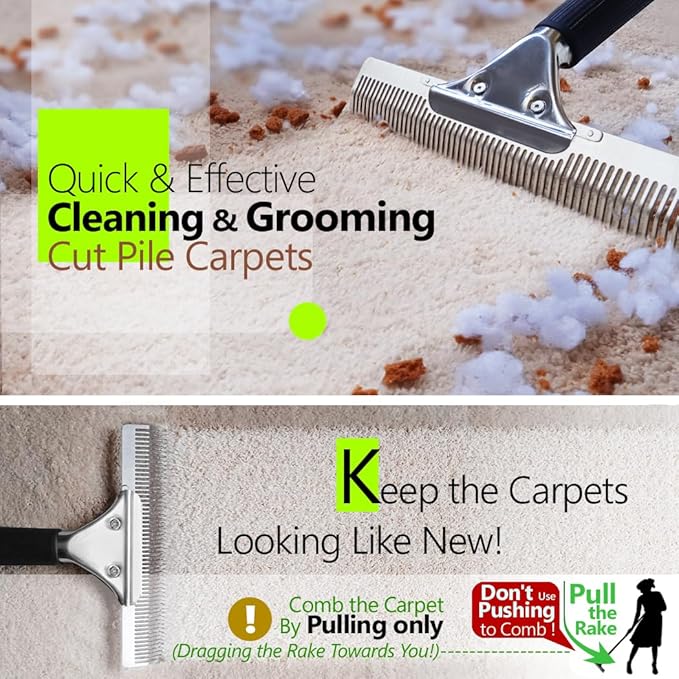 - ☘️KEEPS UR CARPET NEAT☘️The carpet rake for pet hair removal pet hair removal broom can cleaning & grooming carpets fast & easy! With a raking motion, thispet hair carpet rake carpet rake for pet hair removal carpet hair removal tool revives crushed and matted carpet to keep the carpet looking like new. This carpet rake to fluff carpet dog hair remover carpet pet hair removal rake can also be used to remove vacuum tracks, to keep the carpet's surface smooth even, and looking its best.