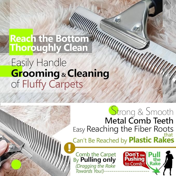 - ☘️METAL CARPET RAKE FOR PET HAIR REMOVAL TOOL☘️ The carpet rake pet hair remover is gentle on your rug & carpet fabrics! with a push-pull motion, the pet hair removal broom rug broom pulls trapped dirt, pet hair and debris up to the surface for more thorough vacuuming. Use the pet hair carpet rake pet hair removal broom carpet hair removal tool carpet rake to fluff carpet & cut pile carpet ! As a pet hair removal tool dog hair remover , your pets will love it too!
