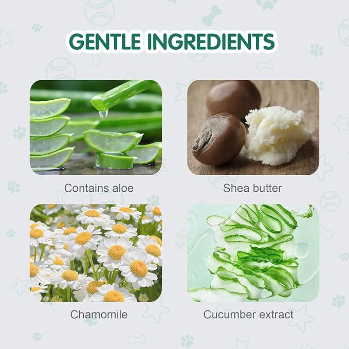• GENTLE INGREDIENTS: Contains aloe, shea butter, chamomile and cucumber extract, helping clean, refresh and condition while giving the coat a healthy shine. Perfect for wiping away odor, dirt and dander from paws, body and bottom between baths.