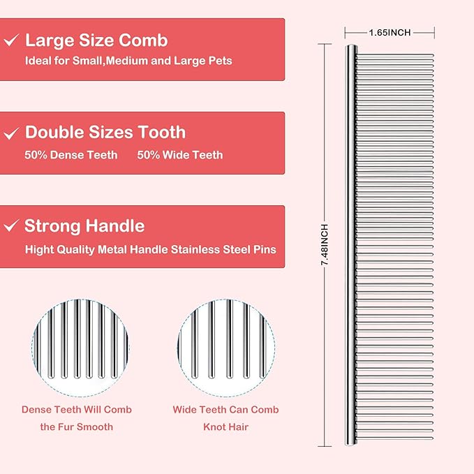 • STAINLESS STEEL COMB 2-IN-1 DESIGN - Sparse teeth to loosen tangled hair & comb large fluffy hair, also can be styled for dogs; dense teeth to comb eyes ears, nose & fine hair on legs; rounded pins with smooth stainless steel to effectively prevent static electricity & tangled hair when combing.