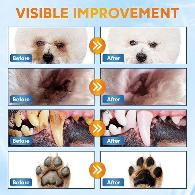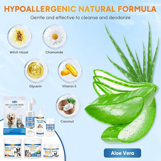 • Pet Cleaning and Care Kit Includes: 50pcs Teeth Cleaning Finger Wipes, 50pcs Ear Cleaning Finger Wipes, 100pcs Pet Eye Wipes, 6pcs Pet Grooming Glove Wipes, 4.06fl.oz Pet Ear Rinse, 5.07fl.oz Pet Paw Cleaner, 1.41oz Paw Balm, 1pcs Soft Silicone Grooming Brush. Effectively and quickly cleans all parts of your pet's body, ensuring your pet is clean and fresh.