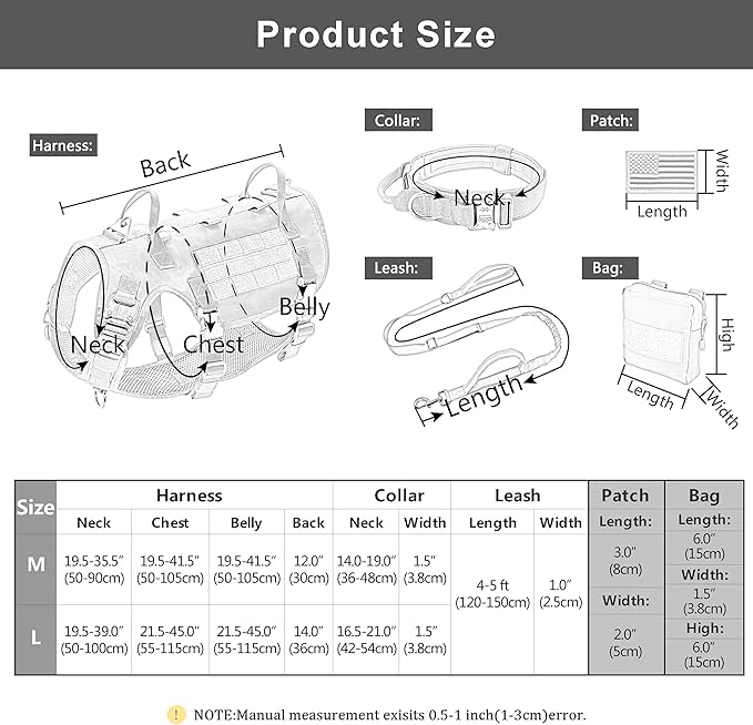 • A GREAT SAVING,ONE-STOP BUYING: A full tactical dog harness collar leash set including: 1 military dog harness + 2 backpack pouches + 1 tactical dog collar with quick release buckles + 1 bungee dog leash with 2 padded handles + 3 flag patches reflective