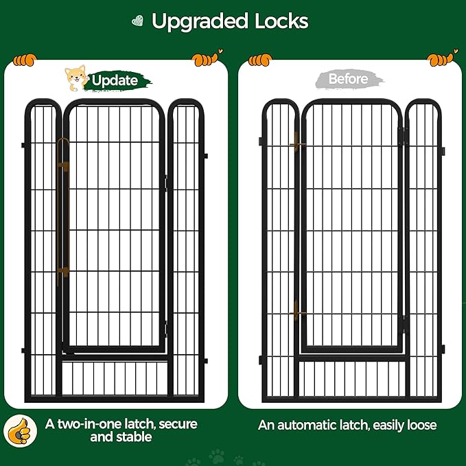 • Safe & Secure: Appropriate bar spacing keeps your pets safe in the exercise pen. Two latches on the door lock automatically as you close. Rounded edges ensure animals be safe, which also prevents causing damage to wood/PVC floors. Stakes not only connect the panels firmly but also anchor the panels to the grassland or soft ground