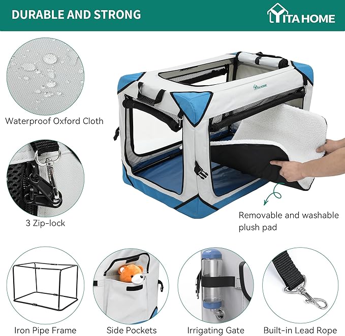 • 【Sturdy and Durable】Designed with robust iron pipe kennel support bars, this collapsible dog crate offers exceptional stability and deformation resistance; Its side zipper closure will not prone to damage or jamming, effectively prevent dogs from climbing or scratching at higher areas; Pets are comfortably contained through the smooth operation of triple zipper-lock system.