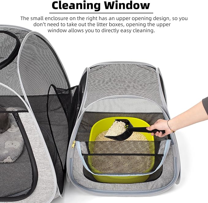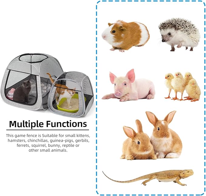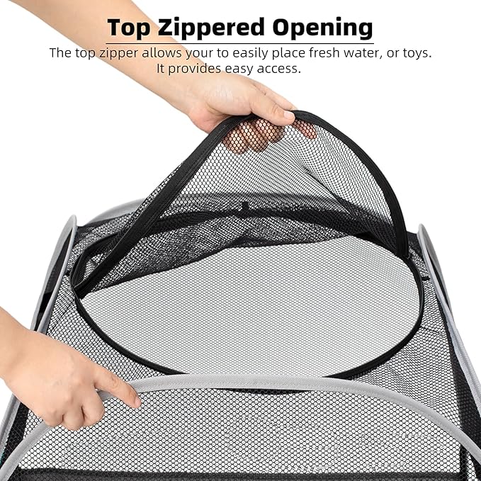• Top & Bottom Zippered Design: The top zipper allows you to easily place fresh water, or toys. It provides easy access. You was able to keep him safely contained when you wasn’t able to monitor him. Bottom zipper you can remove it for washing, if necessary. It's also nice for outdoor use if you wanted to place the enclosure on your lawn.