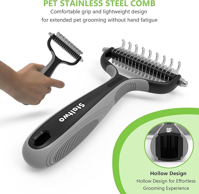 • Multiple uses with a single comb: The pet grooming tool not only works great as a dematting brush or detangling comb, but also as an undercoat comb or deshedding rake. The dematting tool for dogs and cats can comb to cut a matt or tangle then be used as a deshedding brush or deshedding comb