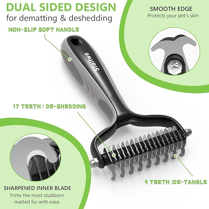 • Dual-Sided Design: Start with 9 teeth side for stubborn mats and tangles and finish with 17 teeth side for thinning and deshedding. Achieve faster and more professional dematting and grooming results