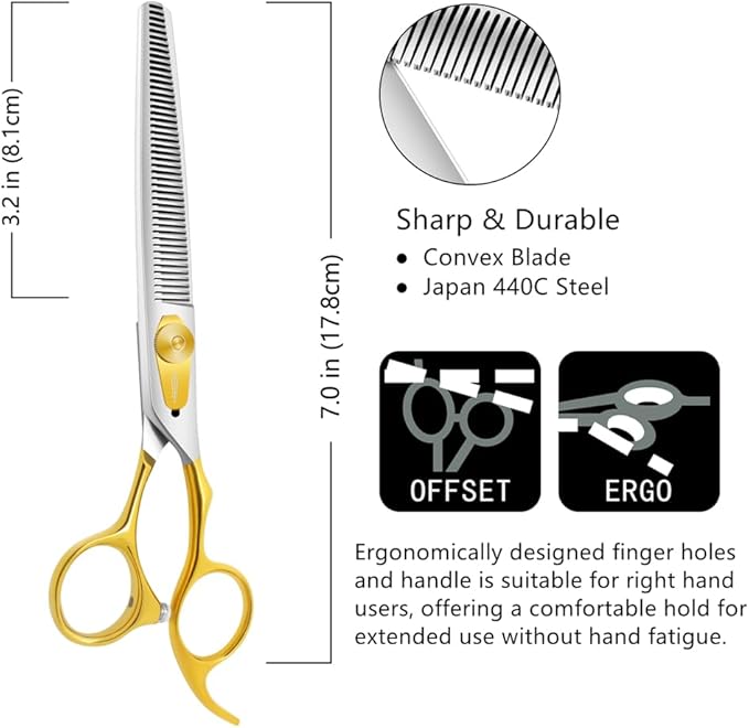 • 【30% Thinning Rate】-- 7.0 inch size with 46 teeth allows for efficient removal of excess hair, thinning rate up to 30%, It keeps your fur baby from looking chopped when cutting hair. This is a good pair of thinners when doing touch ups on clean fur.