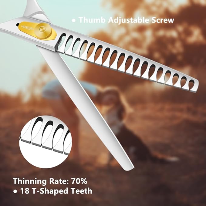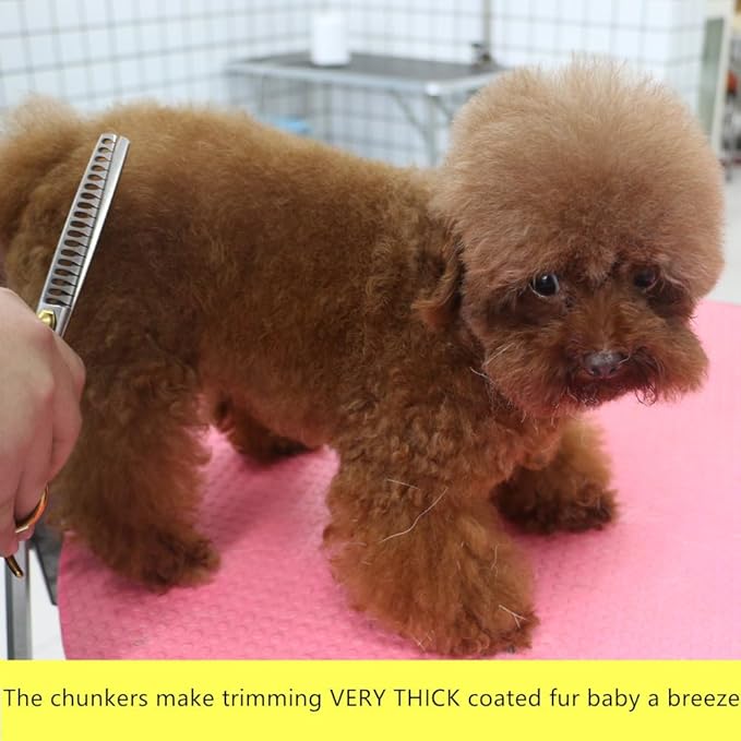 • 【70% Thinning Rate】-- 7.0 inch with 18 teeth allows for efficient removal of excess hair, thinning rate up to 70%, If the dog’s coat has gotten very shaggy and thick,the chunkers will help you cut through his fur easily, making it a breeze to use,so these scissors are perfect for professional groomers or home use.