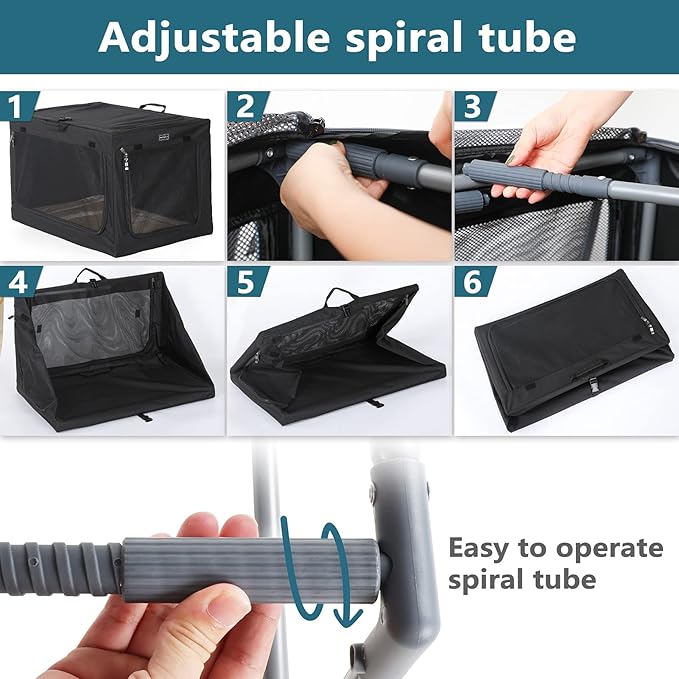 • Our innovative full-pipe support system ensures enhanced stability and safety, preventing any collapse even when your dog leans against the pipe with their paws. When needed, simply rotate the spiral tube downward to effortlessly fold the soft dog crate completely flat. Plus, the top handle makes it convenient for on-the-go transport during your outings.