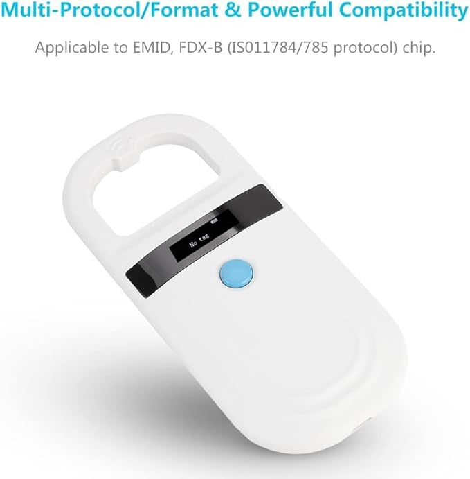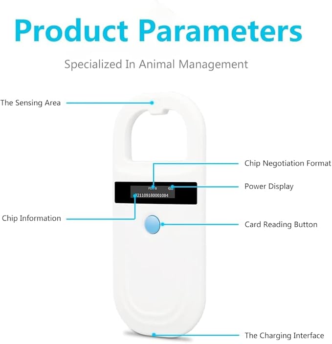 • Pet Chip Canner: This is a low-frequency label scanner that uses wireless recognition technology, and the card reader cannot read the Avid chip. Unable to recognize a 9-digit ID. Only international standard protocols with 15 digits can be recognized. The dog microchip adopts wireless recognition technology and supports reading FDX-B (ISO11784/11785) and EMI microchips(Cannot read the Avid chip)