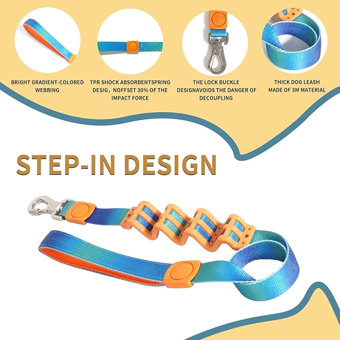 • Complete Walking Set: Elevate your small dog's walking routine with our all-inclusive set featuring a Tri-Color Dog Harness and a mesmerizing purple-pink gradient Shock Absorbing Dog Leash, This set ensures both style and functionality.