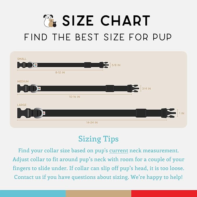 • Adjustable Fit: Each of our three available collar sizes offers an ample adjustable range for a comfortable fit for pup now and allowing some room and flexibility as your dog grows.
