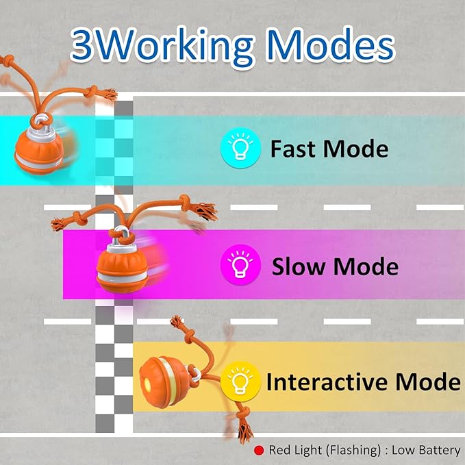 • Three Mode: Fast Mode (blue light), the peppy pet ball for dogs will automatically fast rolling for 5 minutes, then go into standby mode. Slow Mode (purple light), the interactive dog toys balls will slow moving for 5 minutes, then go into standby mode. Interactive Mode (purple light), the active rolling ball for dogs only activate when touch