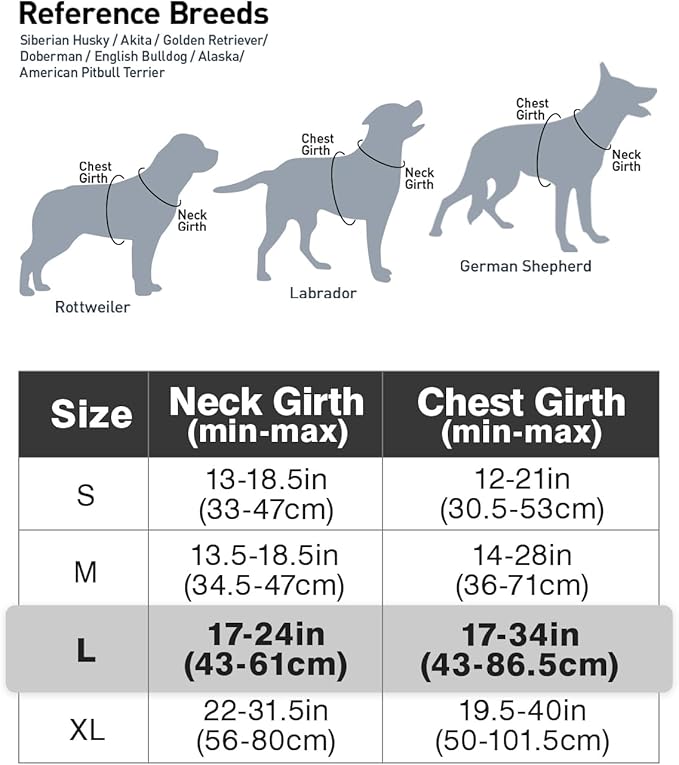 • Recommended Breeds: Medium to Large size dogs - Chest Girth: 17"-34" / Neck Girth: 17"-24", such as Labrador, German Shepherd, Alaska, Rottweiler, Akita, Husky, Golden Retriever, Doberman, Pitbull Terrier