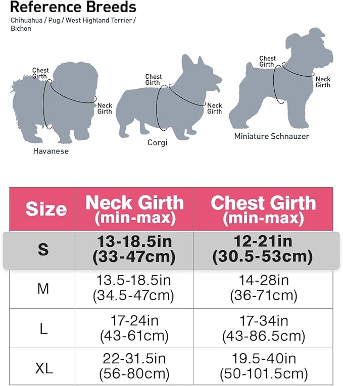 • Recommended Breeds: Small size dogs - Chest Girth:12"-21" / Neck Girth: 13"-18.5", such as Miniature Schnauzer, Pug, Chihuahua, Corgi, Havanese, Bichon, West Highland Terrier