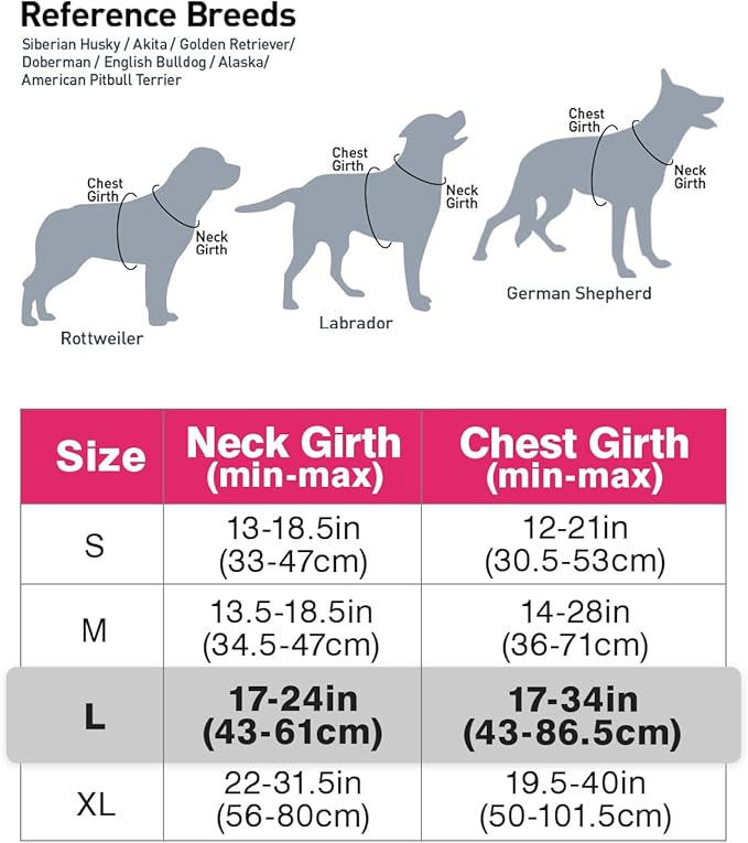 • Recommended Breeds: Medium to Large size dogs - Chest Girth: 17"-34" / Neck Girth: 17"-24", such as Labrador, German Shepherd, Alaska, Rottweiler, Akita, Husky, Golden Retriever, Doberman, Pitbull Terrier