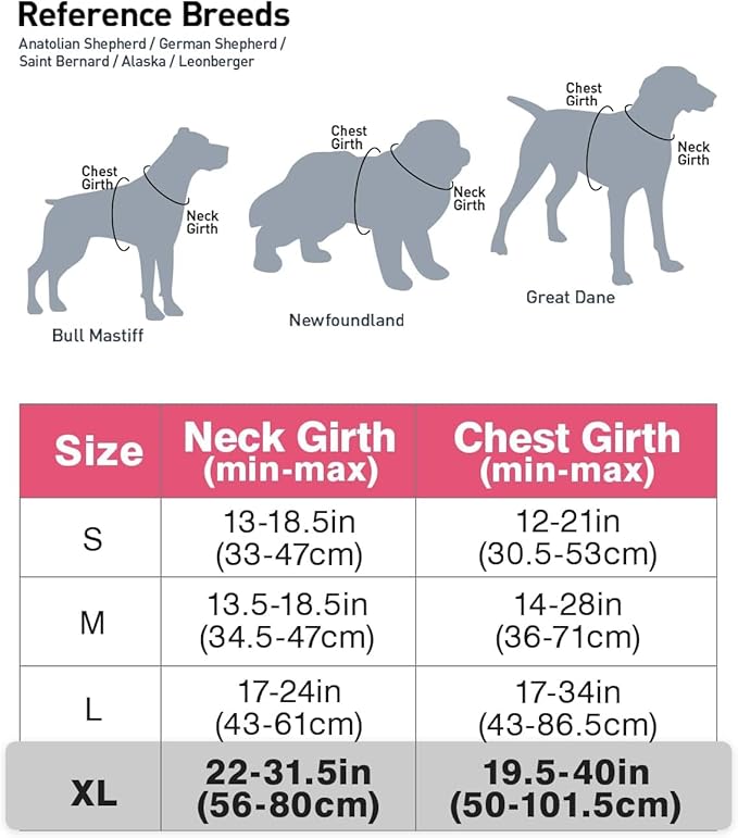 • Recommended Breeds: Large & Extra Large size dogs - Chest Girth: 19.5"-40" / Neck Girth: 22"-31.5", such as Saint Bernard, Bull Mastiff, Newfoundland, Labrador, Great Dane, German Shepherd, Alaska, Akita, Golden Retriever, Leonberger