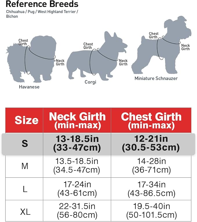 • Recommended Breeds: Small size dogs - Chest Girth:12"-21" / Neck Girth: 13"-18.5", such as Miniature Schnauzer, Pug, Chihuahua, Corgi, Havanese, Bichon, West Highland Terrier