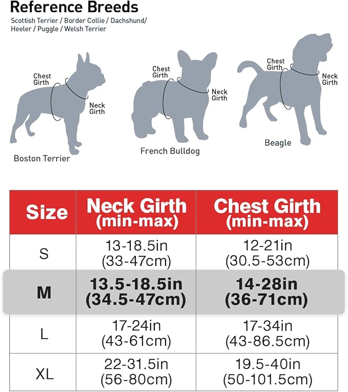 • Recommended Breeds: Medium size dogs - Chest Girth: 14"-28" / Neck Girth: 13.5"-18.5", such as French Bulldog, Beagle, Boston Terrier, Scottish Terrier, Border Collie, Dachshund, Heeler