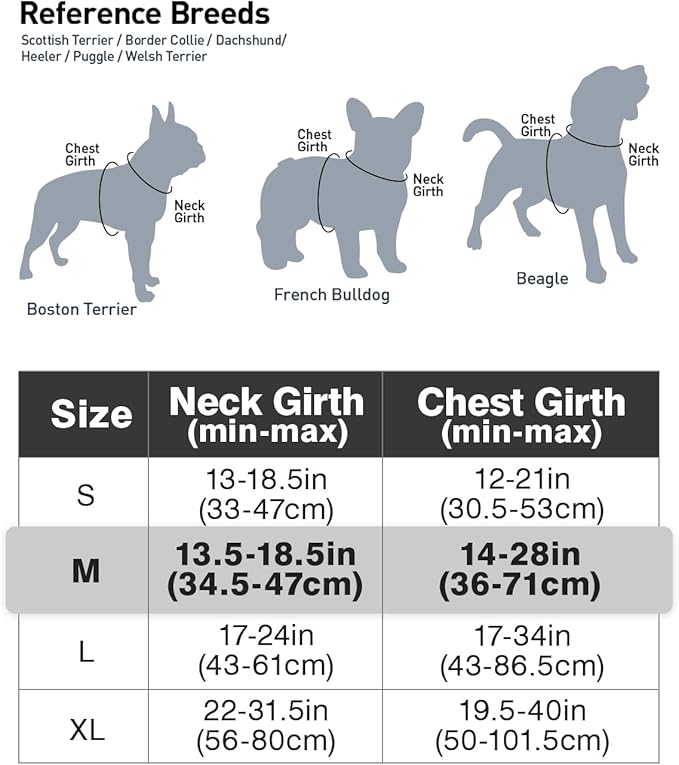 • Recommended Breeds: Medium size dogs - Chest Girth: 14"-28" / Neck Girth: 13.5"-18.5", such as French Bulldog, Beagle, Boston Terrier, Scottish Terrier, Border Collie, Dachshund, Heeler