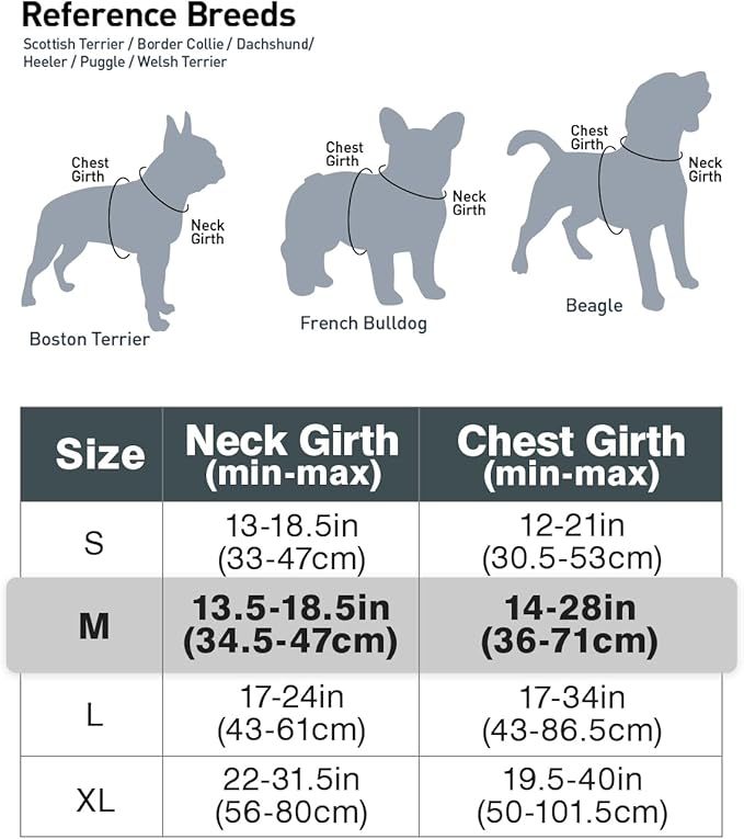 • Recommended Breeds: Medium size dogs - Chest Girth: 14"-28" / Neck Girth: 13.5"-18.5", such as French Bulldog, Beagle, Boston Terrier, Scottish Terrier, Border Collie, Dachshund, Heeler