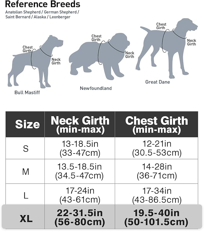 • Recommended Breeds: Large & Extra Large size dogs - Chest Girth: 19.5"-40" / Neck Girth: 22"-31.5", such as Saint Bernard, Bull Mastiff, Newfoundland, Labrador, Great Dane, German Shepherd, Alaska, Akita, Golden Retriever, Leonberger