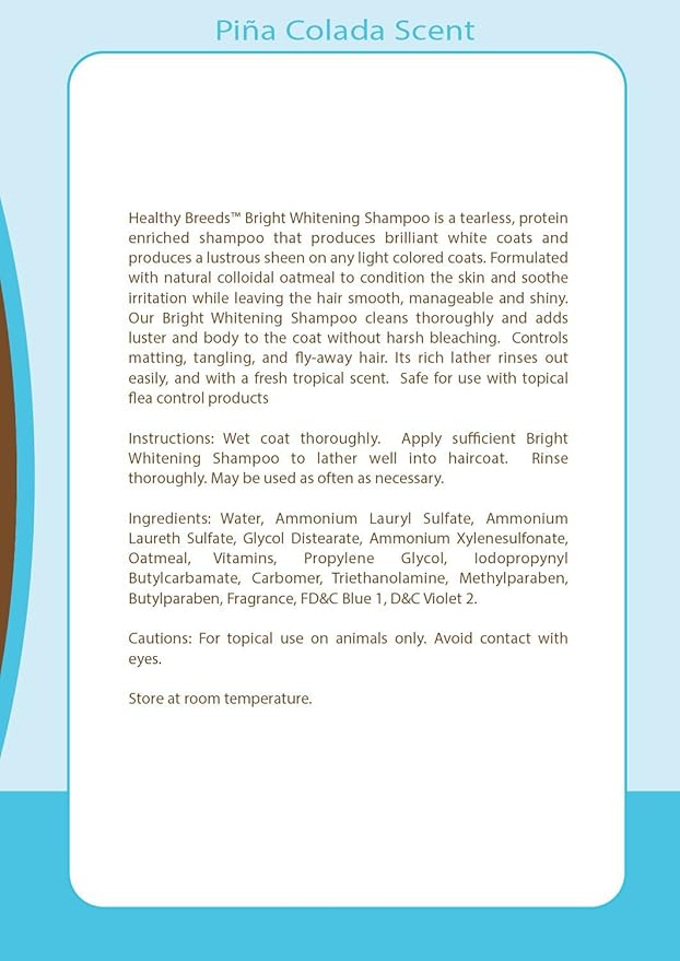 • BRING BACK THEIR NATURAL RADIANCE With the use of pearlescent brighteners, Healthy Breeds Bright Whitening Shampoo produces a glowing sheen on any light-colored coat.