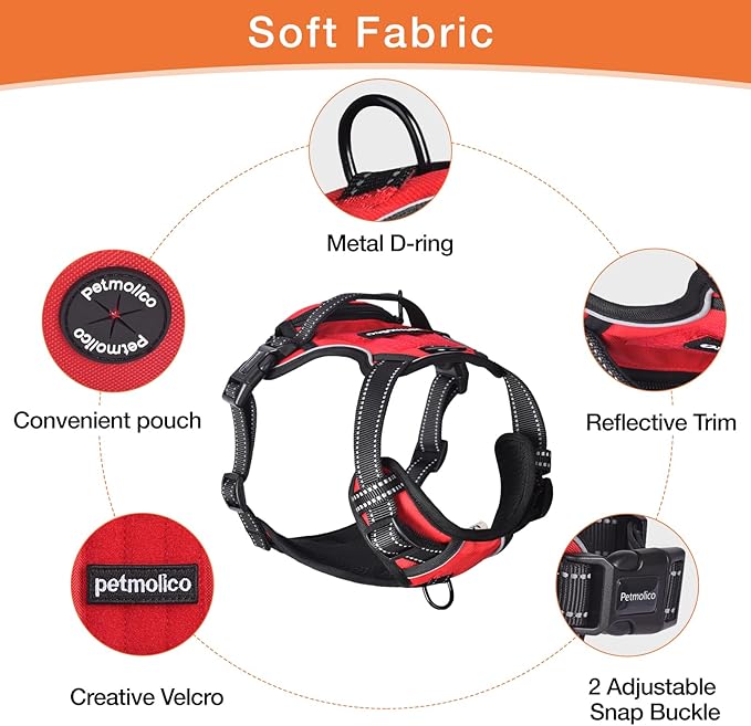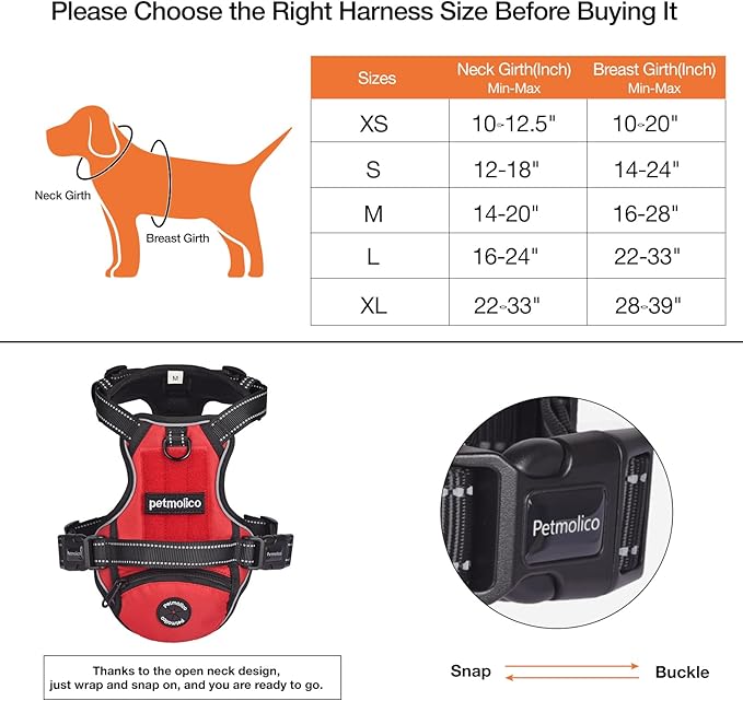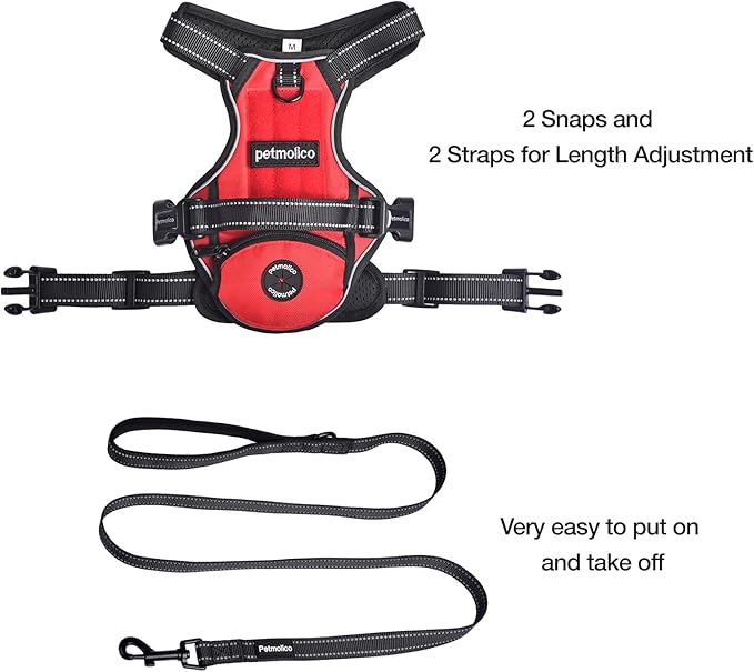 • [ Easy-On and Off ] Petmolic no pull dog harness has 2 buckle closures on each side of vest tail for easily put on and take off. traps on each side of the chest can be adjusted in length to fit your dog's chest size. It may take a while to adjust for the first time, but once it's adjusted, it's fairly easy to put on. And easy to take off by releasing two buckles.