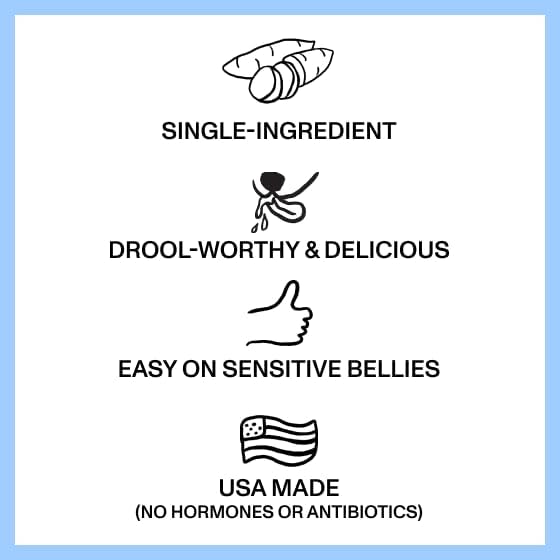 • Single ingredient treat: 100% USA sweet potato, dehydrated to lock in the nutrients your dog needs. All our treats are made with no hormones, antibiotics, grains or gluten, for a guilt-free treat