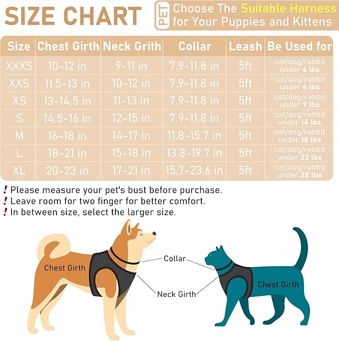 - SIZE CHART - [XXXS: Harness Chest 10"-12", Harness Neck 9"-11", Collar Length 7.9"-11.8"]; [XXS: Harness Chest 11.5"-13", Harness Neck 10"-12", Collar Length 7.9"-11.8"]; [XS: Harness Chest 13"-14.5", Harness Neck 11"-13", Collar Length 7.9"-11.8"]; [S: Harness Chest 14.5"-16", Harness Neck 12"-15", Collar Length 7.9"-11.8"]; [M: Harness Chest 16"-18", Harness Neck 14"-17", Collar Length 11.8"-15.7"]; [L: Harness Chest 18"-21", Harness Neck 15"-18", Collar Length 13.8"-19.7"]; [XL: Harness Chest 20"-23", Harness Neck 17"-21", Collar Length 15.7"-23.6"]. Please always measure your dog and refer to our brand size chart!