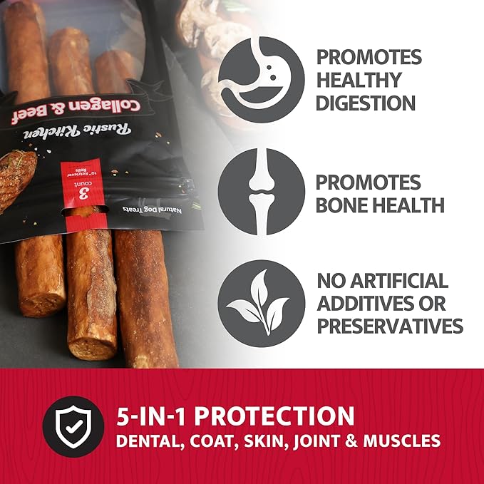 Rustic Kitchen Real Beef Collagen Sticks for Dogs, Collagen Retriever Roll 10" - 3ct, Dog Chews Long Lasting, Rawhide Free for All Dog Breeds