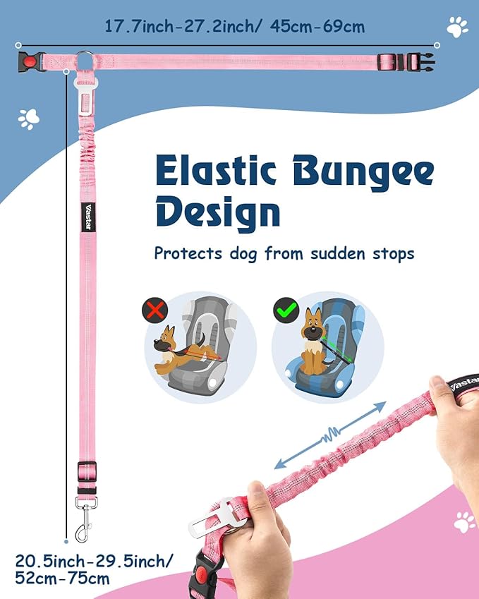 - Elastic Bungee Buffer Design - Featuring a elastic bungee buffer design, Vastar pet seat belt demonstrates a commitment to enhancing pet safety. This ingenious feature imparts shock-absorption capabilities to the leash, significantly fortifying the protection of dogs in the face of abrupt braking maneuvers or sharp turns during car travel.